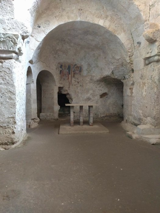 In unserer Bibel entdecken wir, dass Paulus auf seiner Reise nach Rom hier in Syrakusa drei Tage verbrachte. Apostelgeschichte 28,12. Wir sind mega gespannt, ob wir hier irgendwo auf seine Spuren stossen werden. Tatsächlich: in der Krypta der Chiesa San Giovanni sehen wir Steinplatten von denen berichtet wird, dass Paulus darauf gestanden sei, bei seinem dreitägigen Besuch hier in Syrakusa. Übrigens unter dieser Kirche hat es Katakomben mit etwa 10’000 Gräbern!