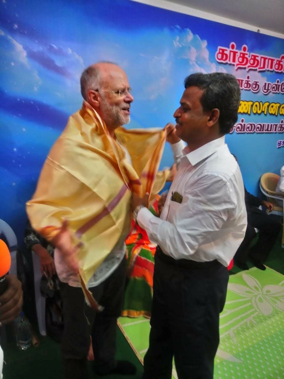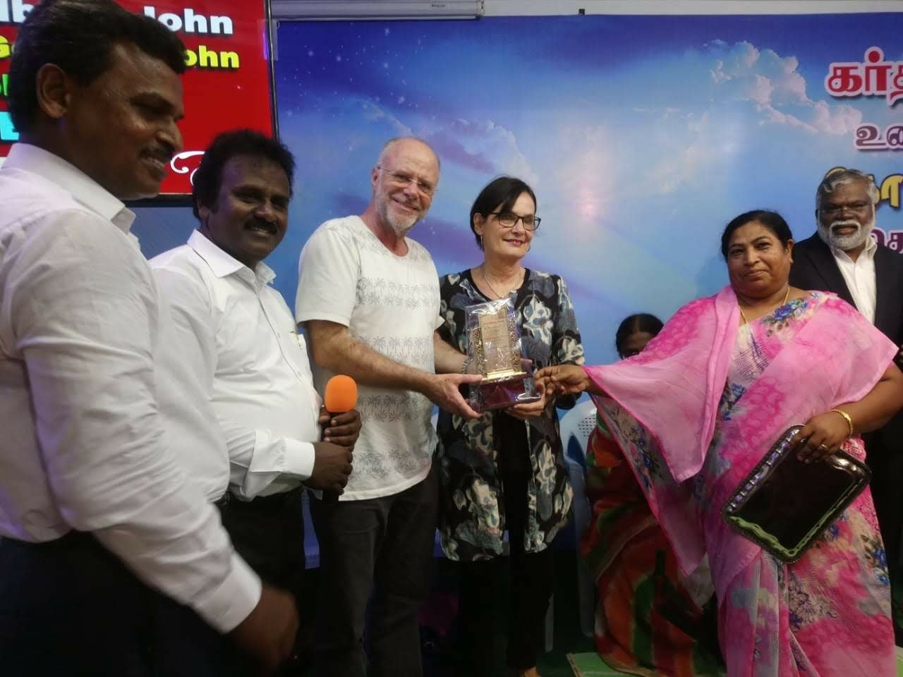 Danach kommt die Überraschung: Mrs Meena, die Ehefrau von Pastor Doraiswami geht nach vorne und berichtet über ihren Werdegang vom Hindu zur Christusnachfolgerin. Nachdem sie sich mit ihrem Mann auf den Weg als Evangelisten machten, wurden sie sehr in die Enge getrieben von den Hindus. Zusätzlich war ein Kredit von 350’000 Rupies bei der Bank zur Rückzahlung fällig. Es sah alles so sinnlos aus und nach viel Misserfolg beschlossen sie, sich und ihre drei Kinder umzubringen. Die Frau forderte ihren Mann jedoch auf, ihr noch vier Tage Zeit zu geben, damit Jesus eingreife. Und er hat eingegriffen. Das Blatt wendete sich zu ihren Gunsten. Pastor Frank gab ihnen damals einen kleinen Betrag und sagte: „Dieser Betrag wird euch helfen!“ – Ja aber, das ist doch viel zu wenig. Trotzdem ging sie zur Bank und brachte diesen Betrag. Nach einem Gelächter und absolutem Unverständnis, fand die Bank einen (Wunder-)Deal, welcher ihnen völlig überraschend half. Das Resultat davon: beide leben noch und werden von Jesus sehr gebraucht. Ihre Kinder sind alle auf einem guten Weg unterwegs und die älteste Tochter wurde Professorin an einer medizinischen Fakultät. – Viele Menschen erhalten bei ihnen Befreiung und Hilfe, wenn sie dämonisch belastet sind. Dieses Ehepaar hat Autorität in Jesus Christus, den Feind und seine Mächte zurück zu drängen und Menschen zu befreien.