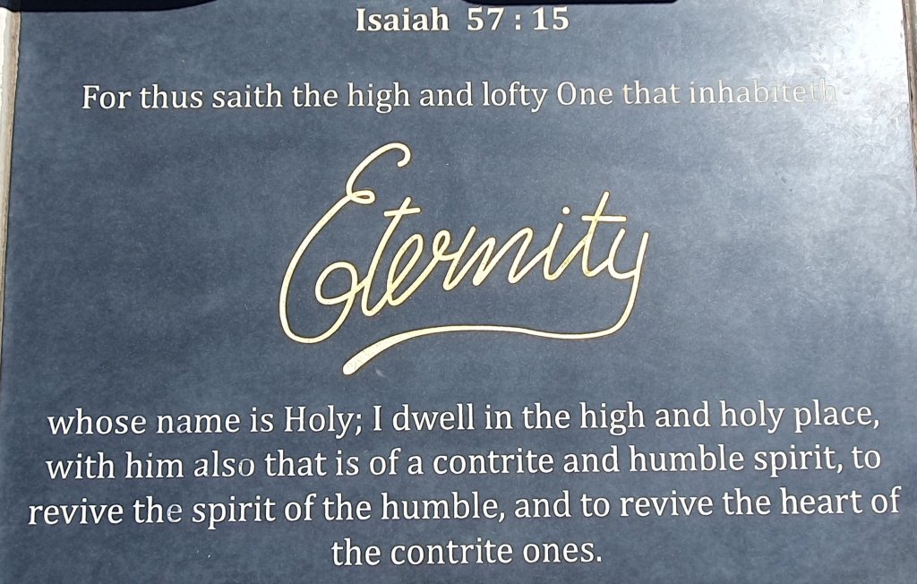 Jesaja 57:15 Denn so spricht der Hohe und Erhabene, der wohnt in der EWIGKEIT und dessen Name »Der Heilige« ist: In der Höhe und im Heiligtum wohne ich und bei dem, der zerschlagenen und gedemütigten Geistes ist, damit ich den Geist der Gedemütigten belebe und das Herz der Zerschlagenen erquicke.