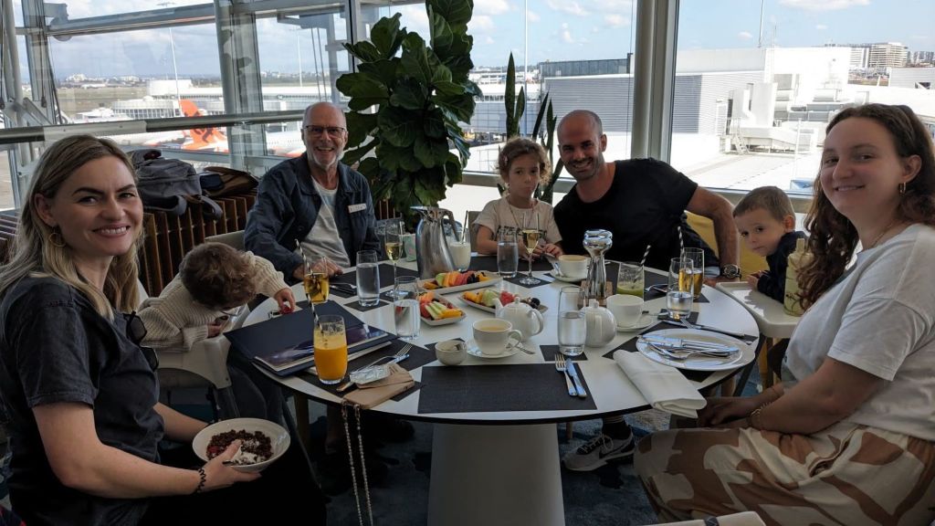 Dann also los. Zuerst geniessen wir vor dem Abflug ein feines Mittagessen in der Virgin Lounge. Welch coole Aussicht zu dem feinen Essen.