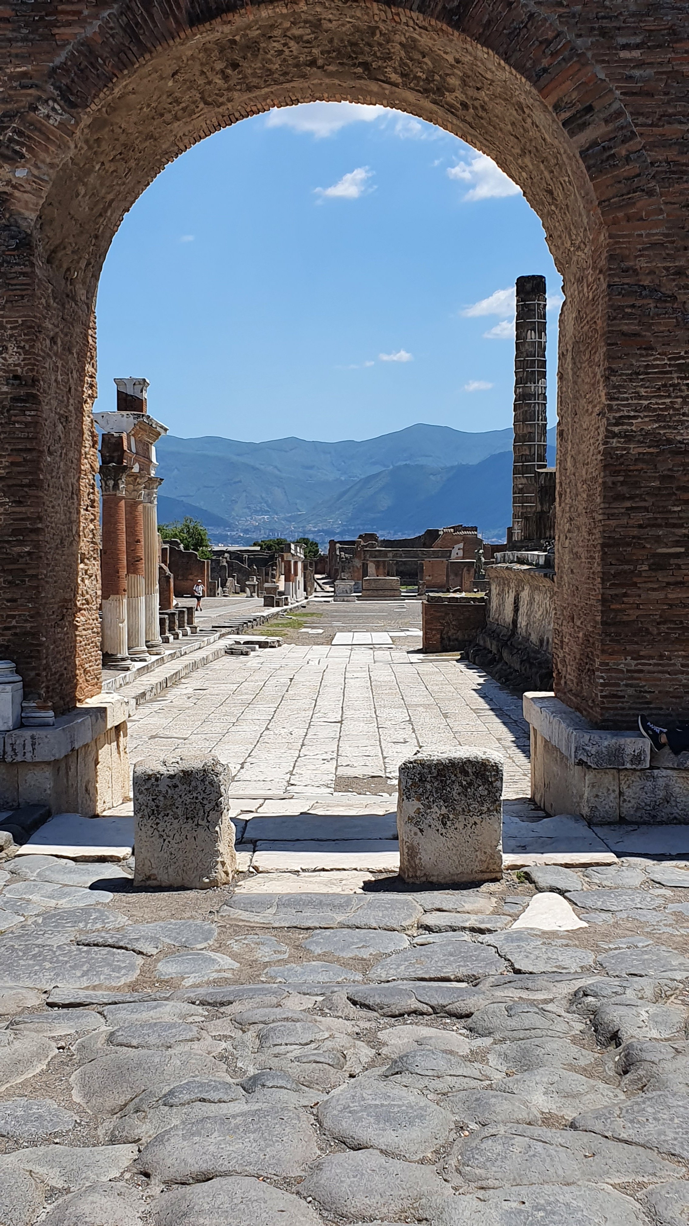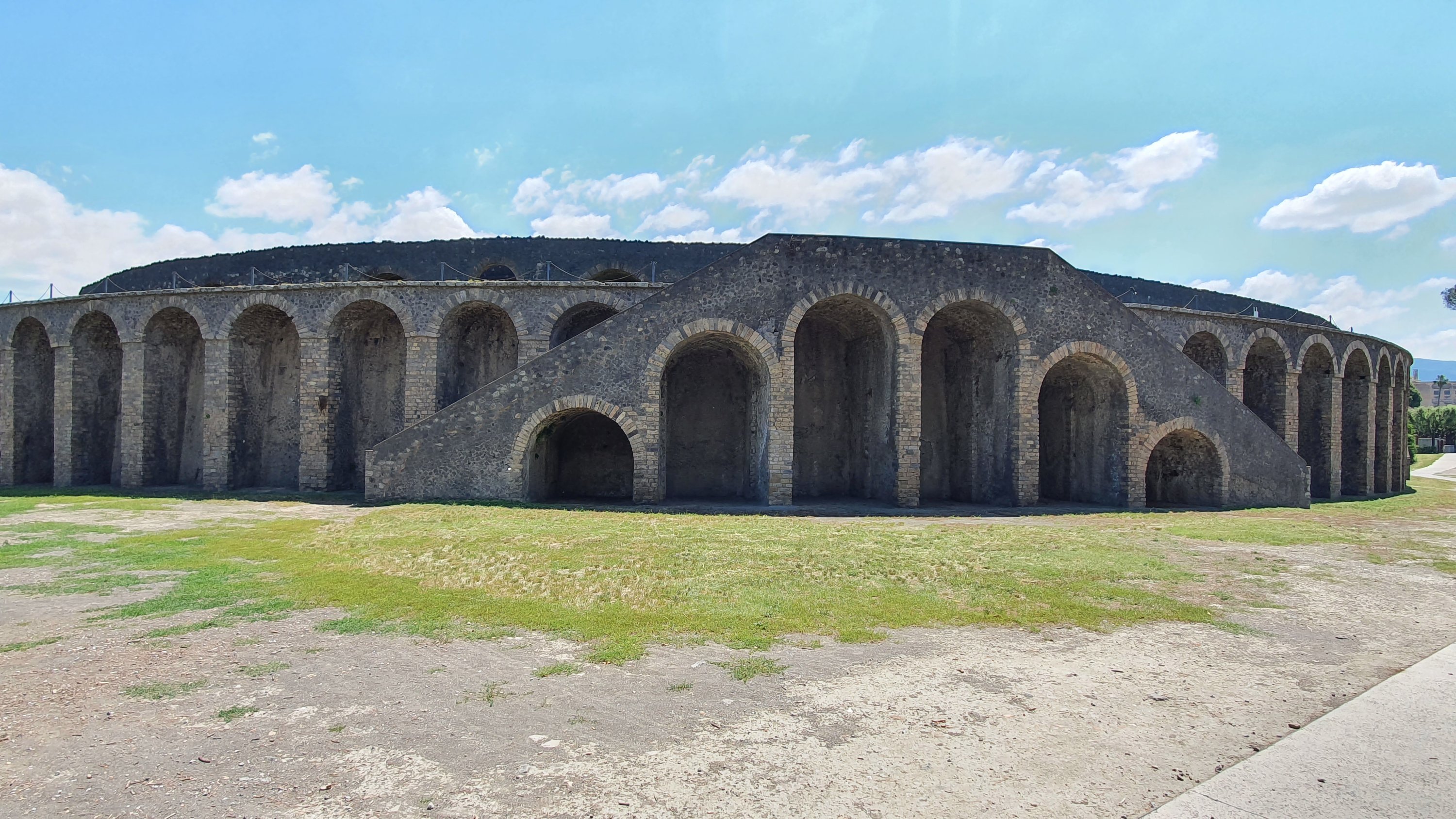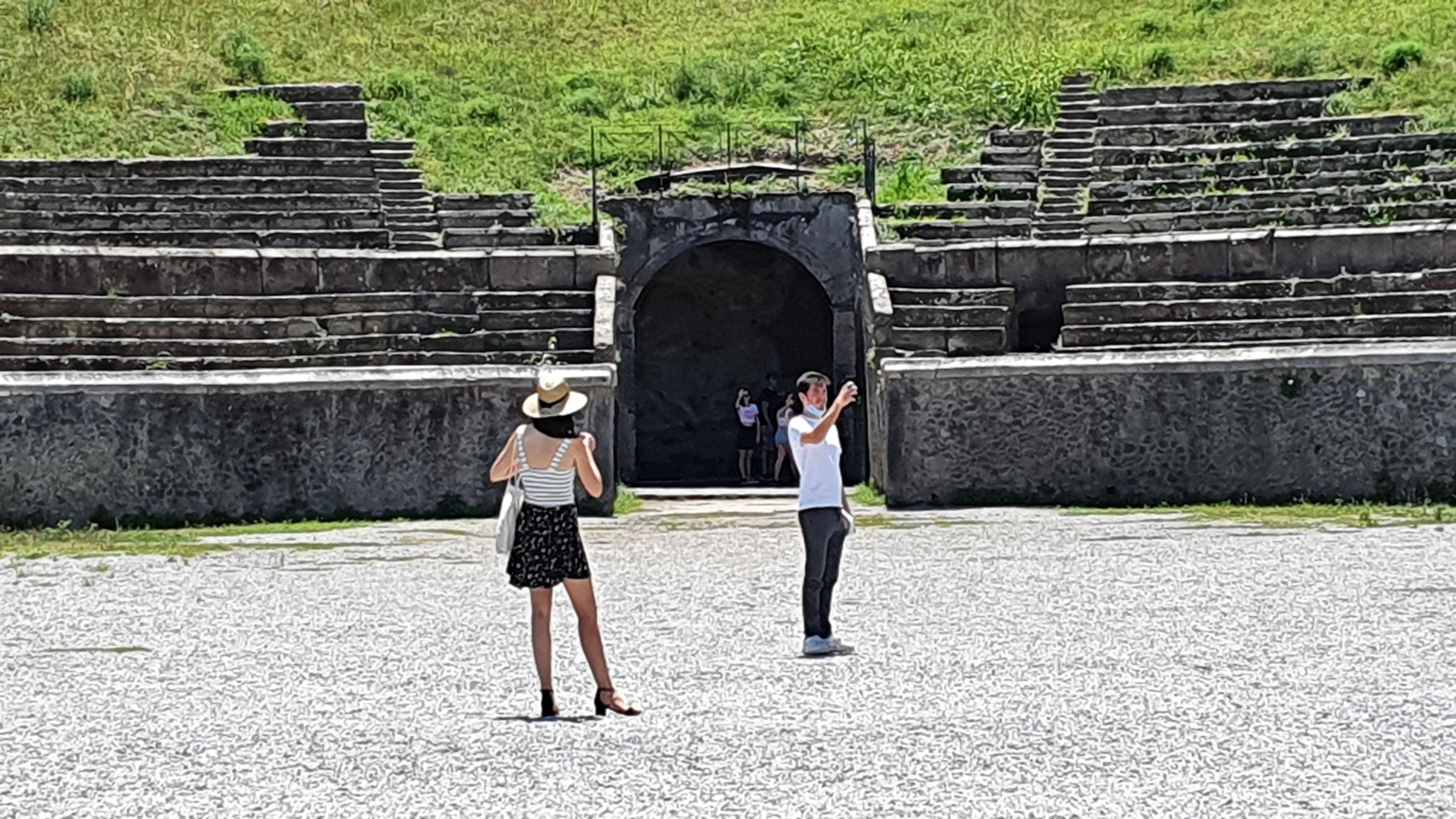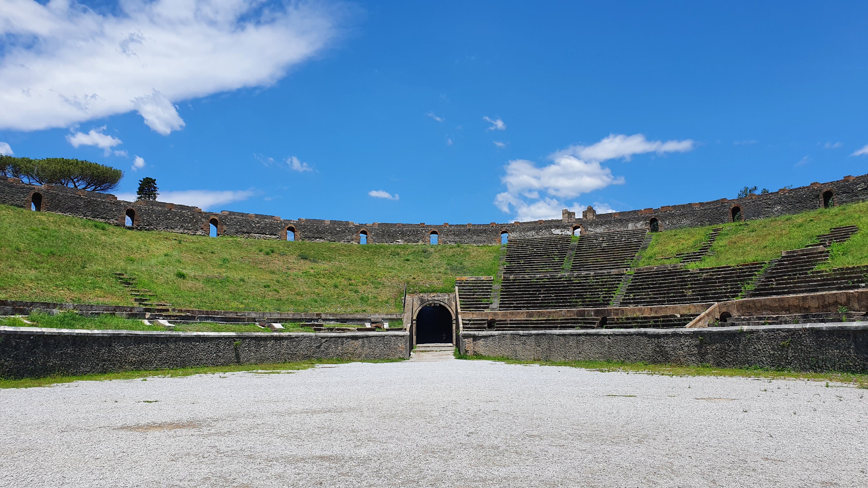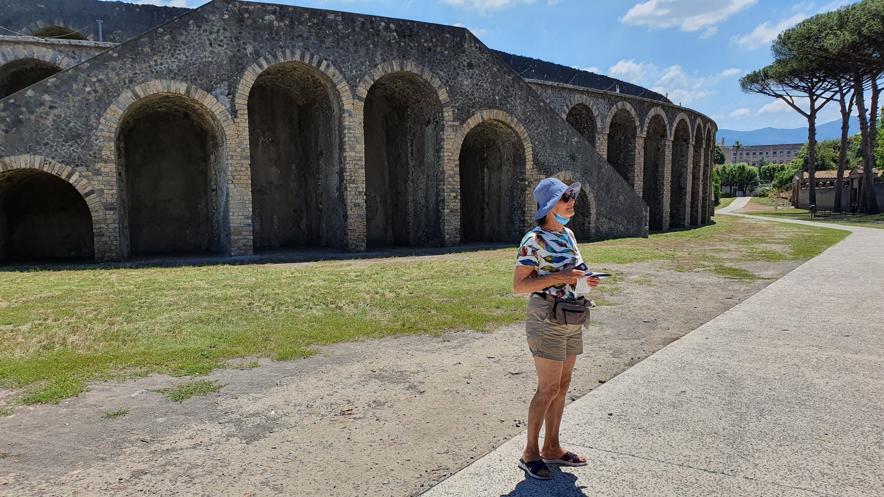 Was für ein super Erlebnis, diese einmalige, verschüttete Stadt zu besuchen, über die wir uns zuvor eingehend informiert haben. Bei strahlendem Sonnenschein beginnen wir unsere Tour beim Amphitheater. Es soll die älteste erhaltene Arena der Römer sein. – Eine Remiszenz an unsere Lockdowns zur Coronazeit: Als es im 1. Jh. zu Fankämpfen mit Toten und Verletzten kam, wurde die Arena für 10!!! Jahre geschlossen. (Da soll sich noch jemand über 2 Monate Lockdown beschweren).