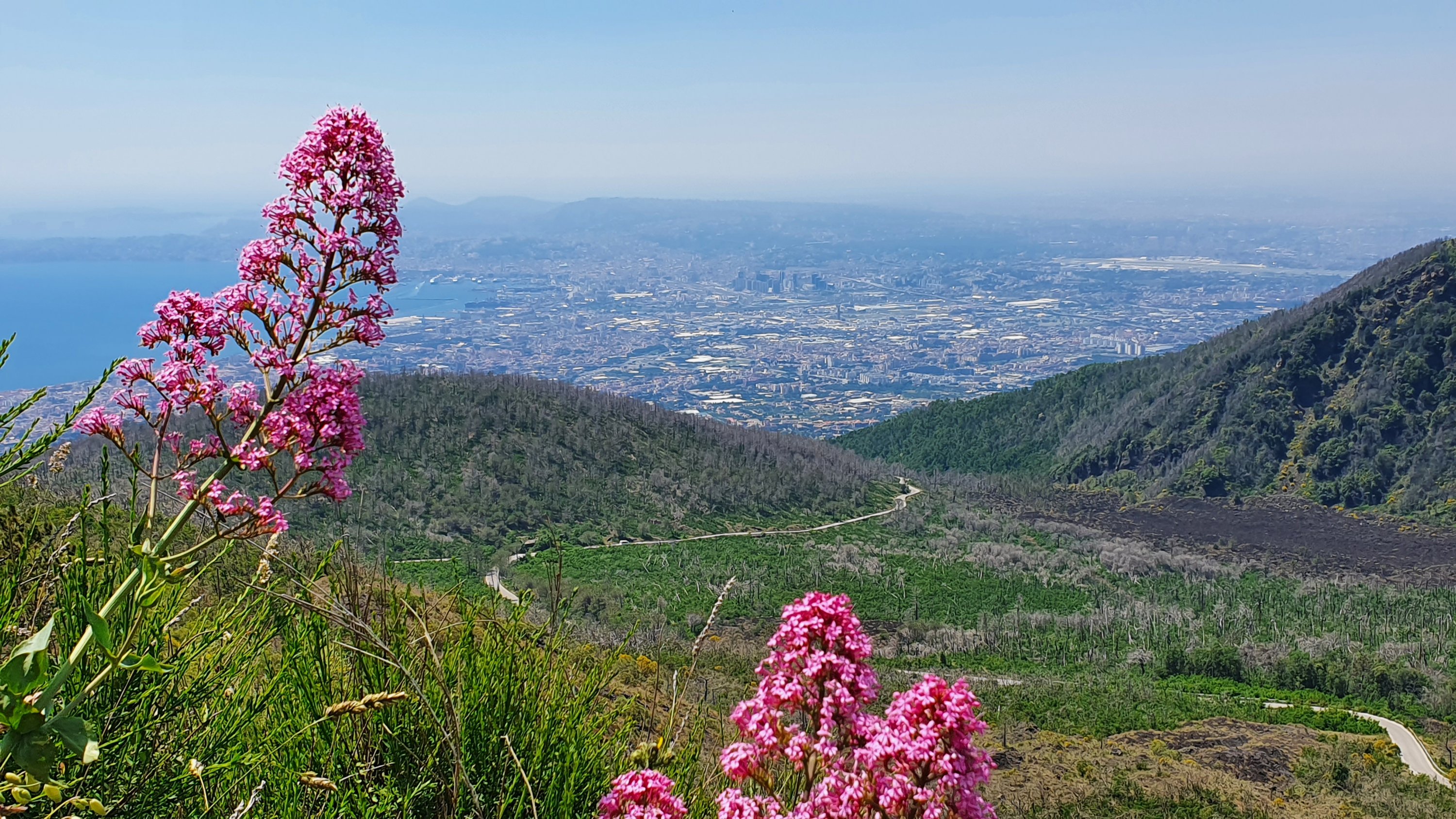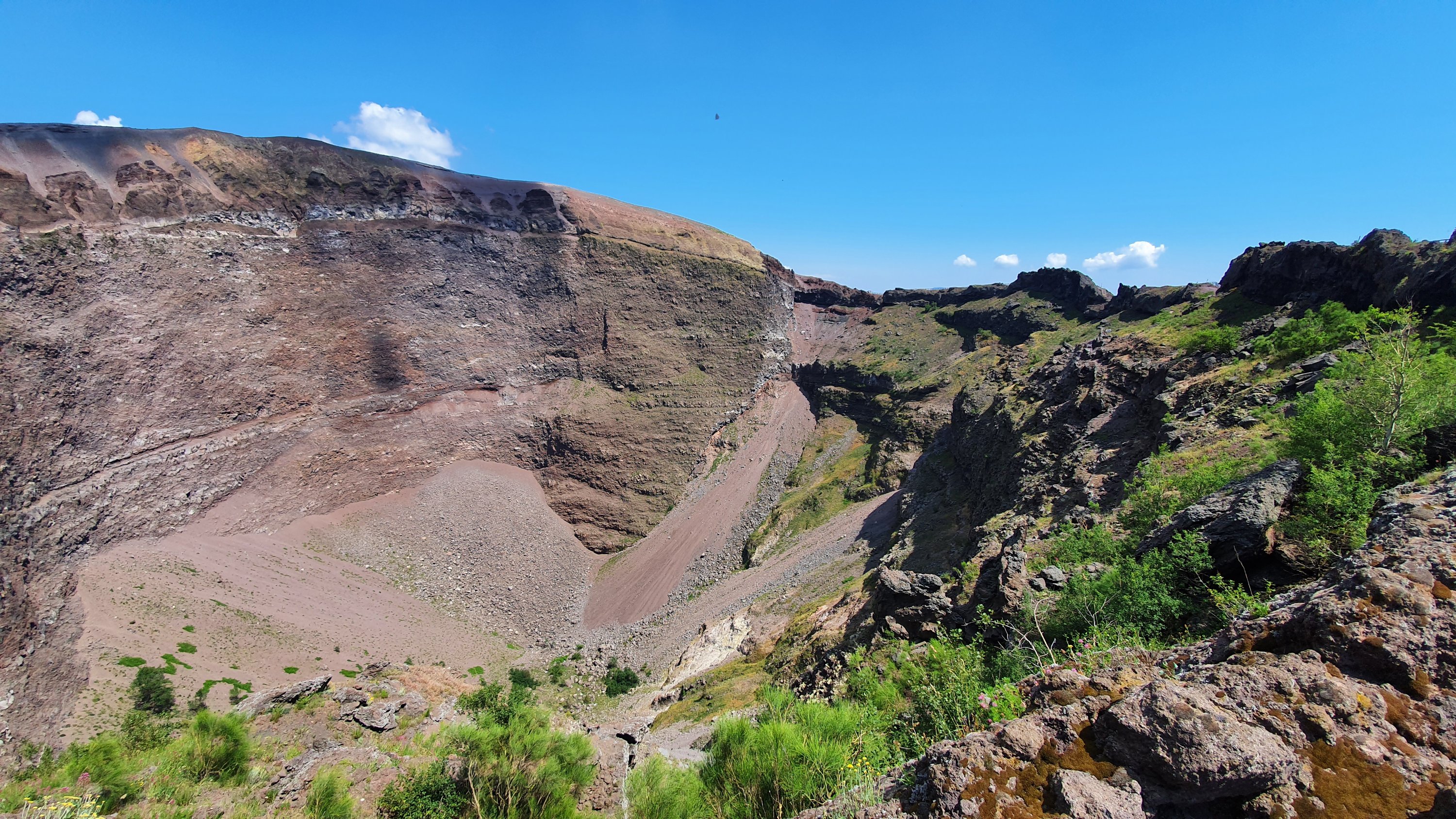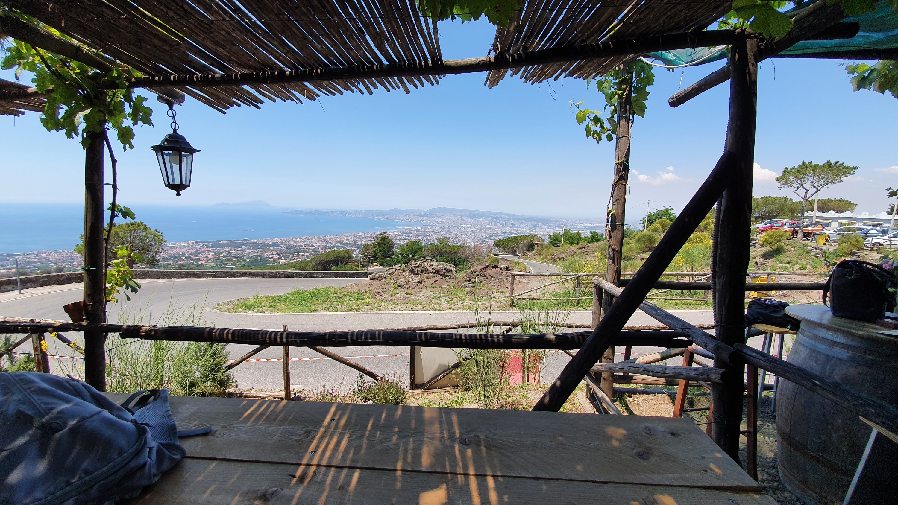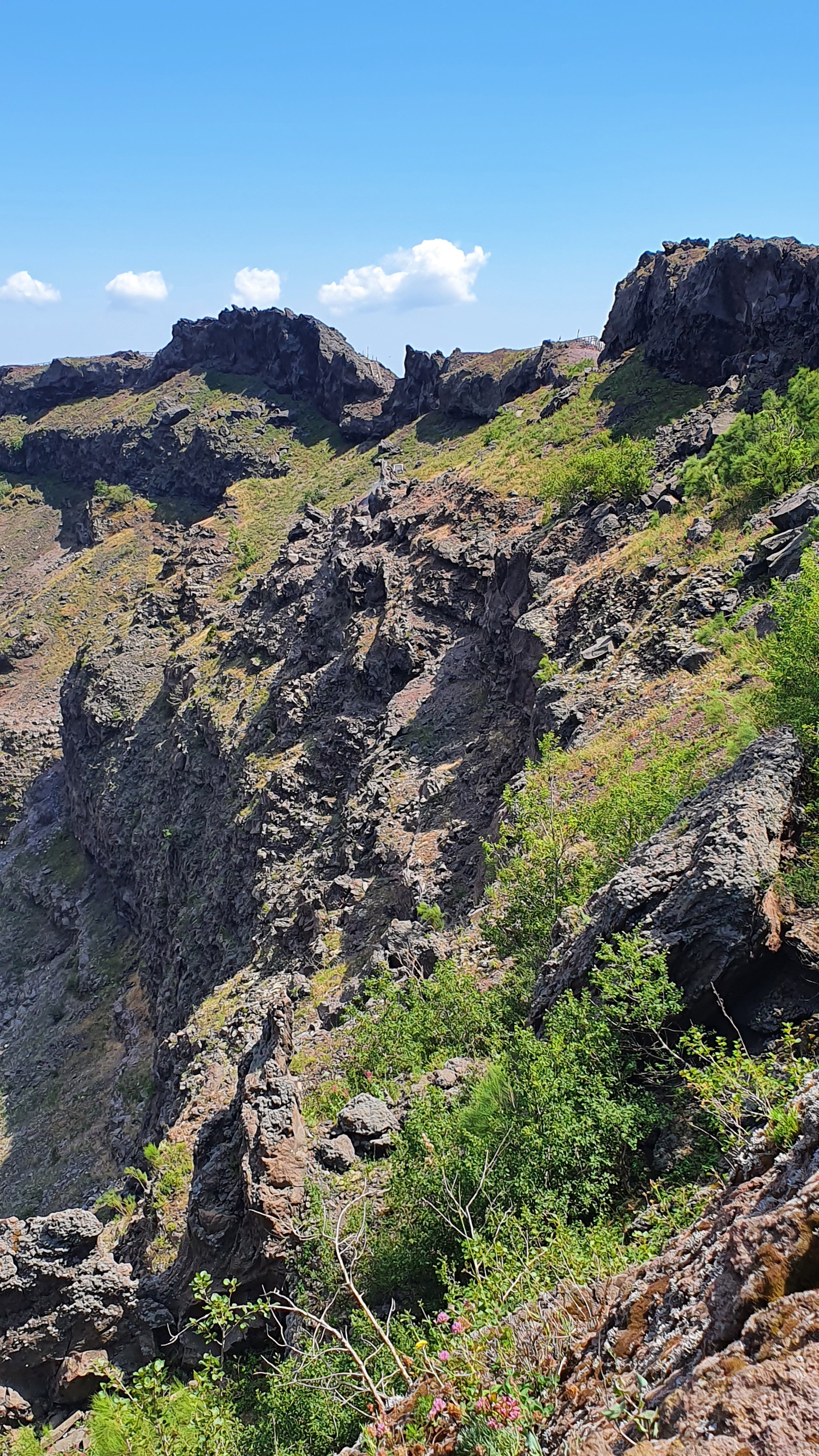 Nach langwierigem Ticketgerangel (natürlich wegen Corona) finden wir endlich die Möglichkeit, unsere Tickets zu kaufen und auszudrucken. Nun geht es immer weiter hoch, bis wir sehr weit oben auf dem Parkplatz ankommen. Und jetzt los zu Fuss nach oben bis zum Kraterrand. Wau, was für eine gewaltige Aussicht von diesem Kegel. Der majestätische Golf von Neapel mit den beiden Inseln Ischia und Capri. Wie wundervoll ist das!