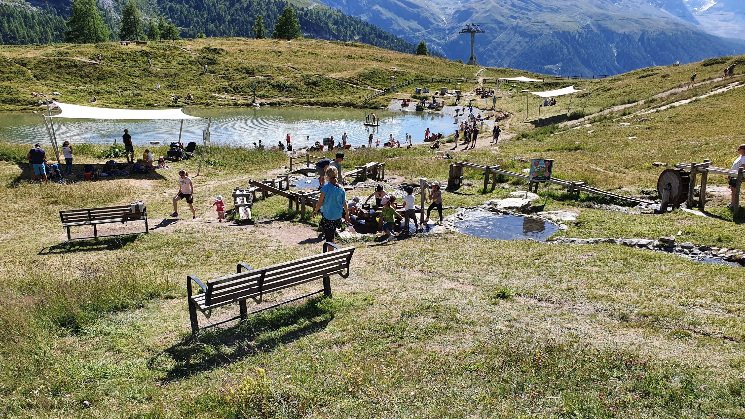 Während dem unsere Jungen mit der Gornergratbahn hochfahren, hüten Martha und ich Ruby und geniessen miteinander ein Eis. Dann entscheiden wir uns kurzfristig hochzufahren auf den „Sunnegga“, wo sich uns ein schöner Spielplatz mit eindrücklichem Blick auf Gletscher, das Matterhorn und weitere 4000er eröffnet.