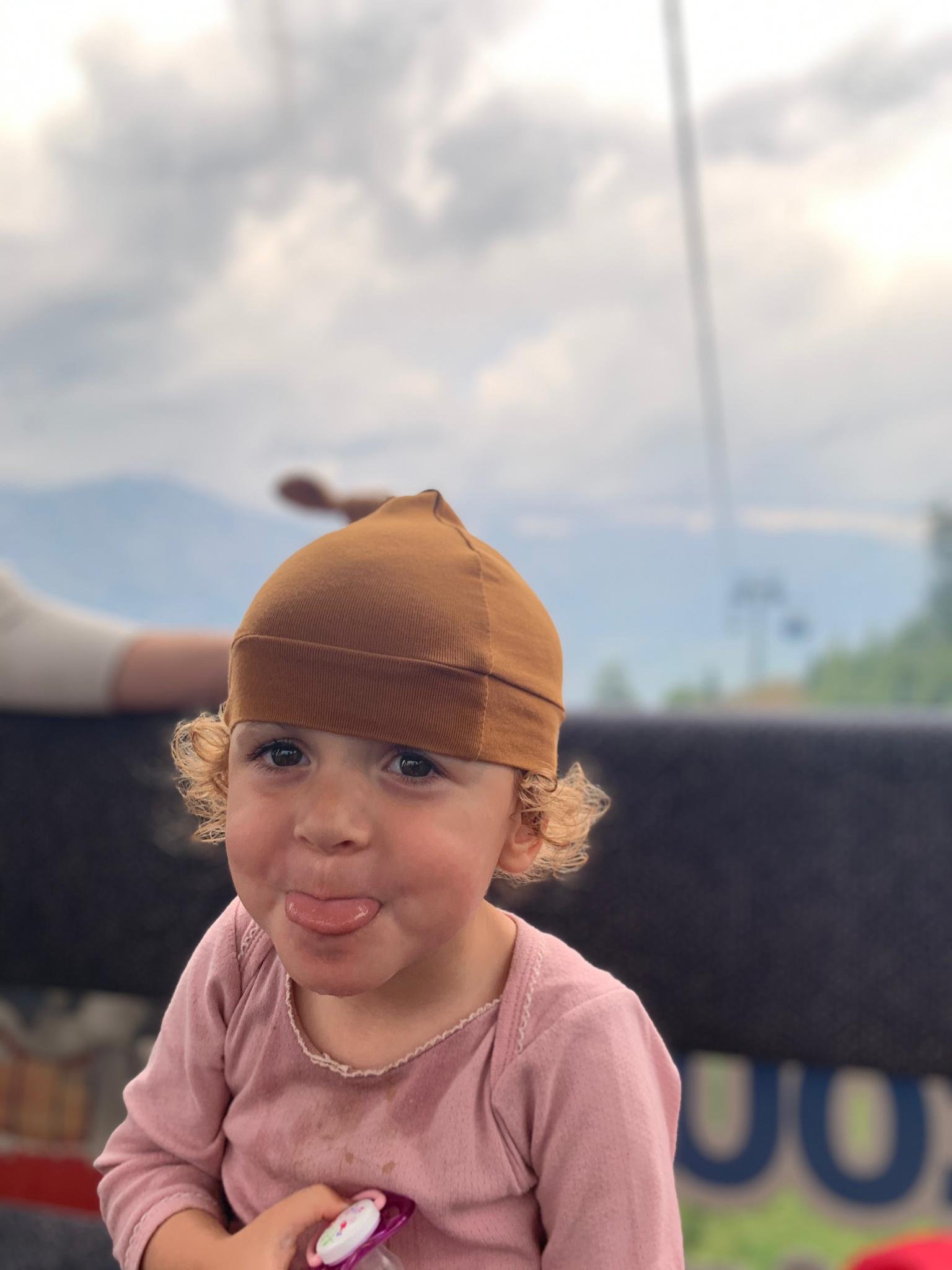Weiter gehts zu einem schönen Picknick- uns Spielplatz. Ruby will alles ausprobieren. Das Bächli mit dem kalten Wasser oder den schweren Holztöff. Nichts lässt Ruby aus. Und dann gibts als Desser einige glanzvolle Grimassen mit Elliotts Chäpli auf dem Kopf.