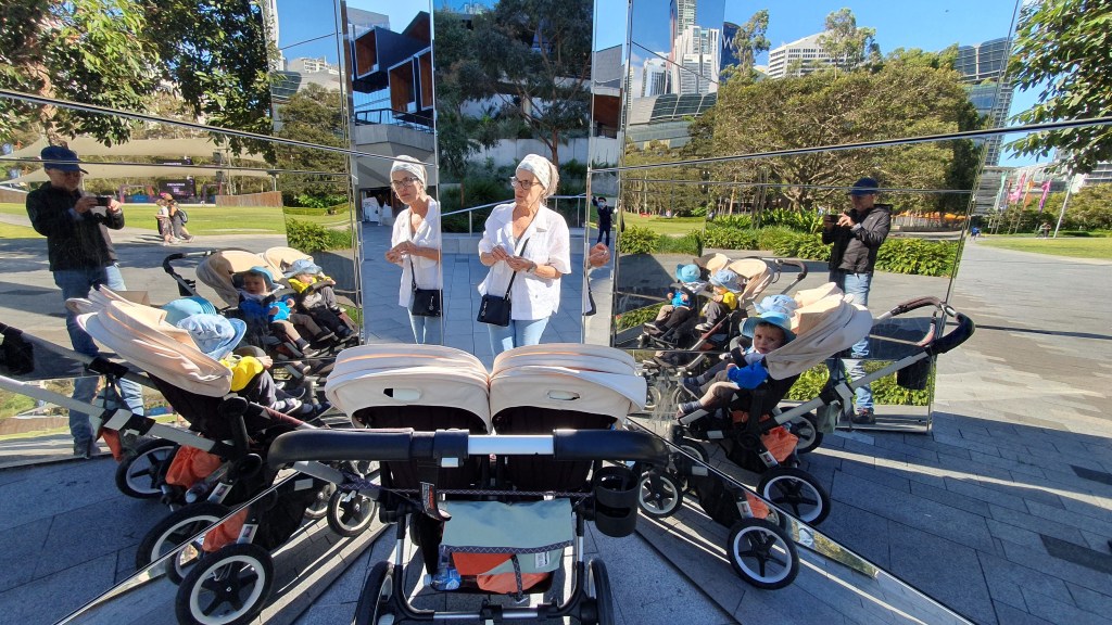 Nun wohnen wir also schon mehr als zwei Wochen im Herzen der Stadt Sydney. Der CBD (=Central Business District) ist vielleicht nicht der Ort, wo du als Familie mit drei kleinen Kindern Ferien machen möchtest. Wie schon geschildert, sind wir umgeben von Hochhäusern und wohnen im 23. Stockwerk. Wenn wir zur Hoteltüre rausgehen, begrüsst uns in der Regel ein steifer Wind, der um die Hausecken zieht. Heute war es wie eine Bise, wie wir sie aus der Schweiz kennen. Nach Tagen mit etwa 25°C waren es heute nur noch etwa deren 15. Trotzdem zogen wir am Morgen los zum Spielplatz am Darling Harbour.